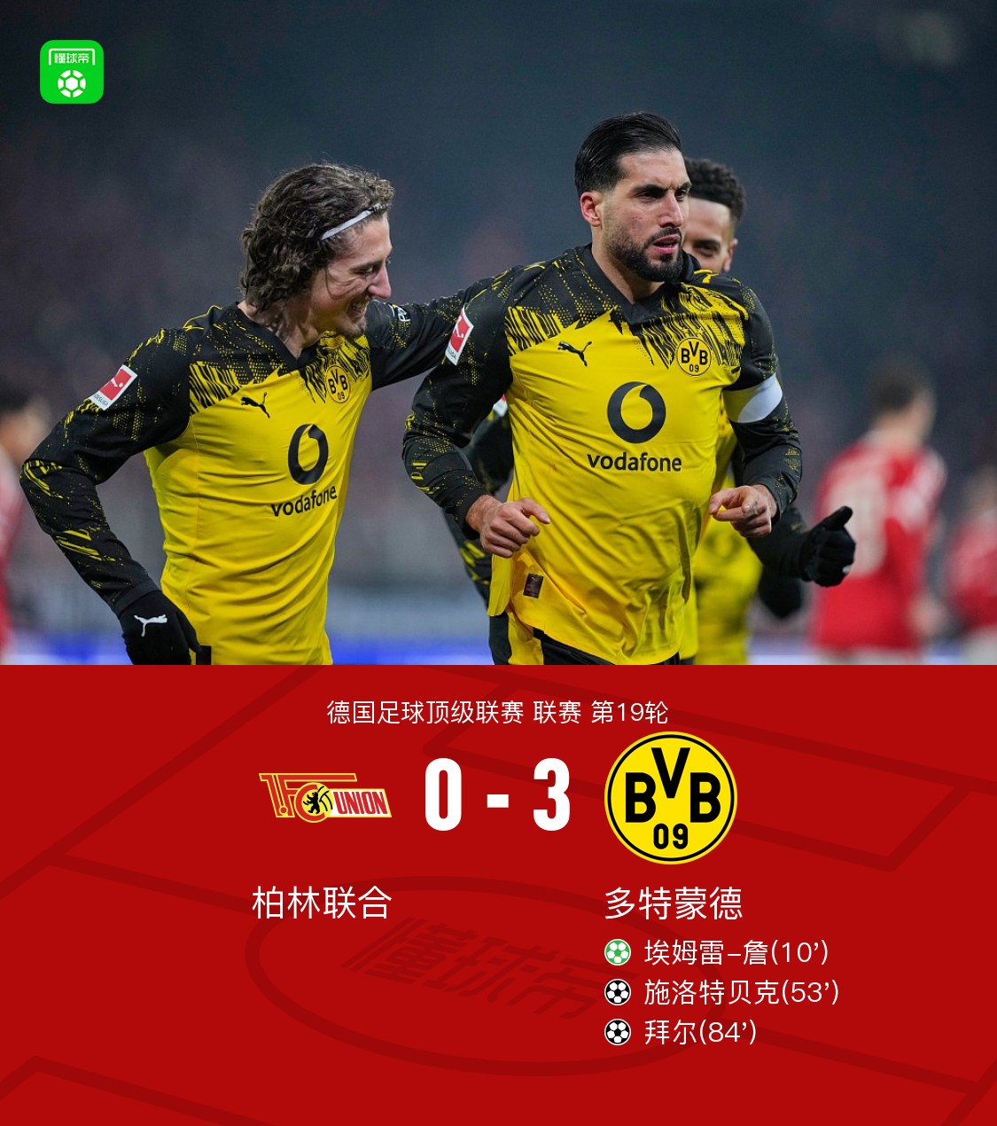 北京时间1月25日1:30,德甲第19轮继续进行,多特蒙德作客老林务所畔体育场挑战柏林联合,本场主裁判为哈特曼。上半场,吉拉西造点,埃姆雷-詹操刀命中。下半场,瑞尔森角球助攻施洛特贝克头槌破门,乔布-贝林厄姆助攻拜尔低射建功。最终,多特3-0客胜柏林联合。点击查看本场比赛详细数据>>点击查看德甲完整积分榜>>关键事件第10分钟,吉拉西突破造点,埃姆雷-詹操刀命中,多特1-0